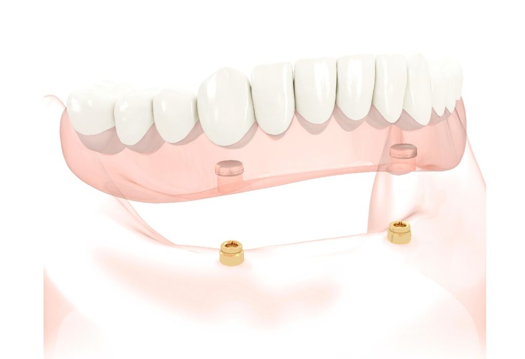 Cette techniques avec 2 implants est essentiellement utilisée pour la mâchoire du bas.Votre prothèse complète classique viendra se clipser sur 2 implants (principe des boutons pressions).